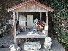 橋を渡り、左折して川沿いに進むと、右手に小祠があり、石仏が安置されている。左手の石仏には弘化という文字がかろうじて読める。