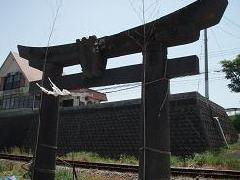 その先で急に道幅が狭くなったところがあり、そこから右折、すぐ先で左折して進むと左手に「猛島神社」がある。ここは昔は今の高島、当時の鷹島にあった鷹島大権現を松倉重政が島原城築城時にこの地へ移したもので、松平忠房が入国すると領内7万石の総社として猛島大明神と改め社領を寄進、社殿を改修した。海辺にあるこの社殿も寛政の大津波で流され、文化10年(1815)に復旧、社殿前の鳥居はそのとき破壊されたものを再建したものという。