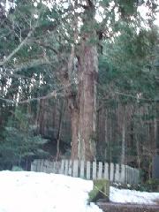 旧道を進んでいくと、左手に「諏訪神社」があり、境内には巨木が立っている。