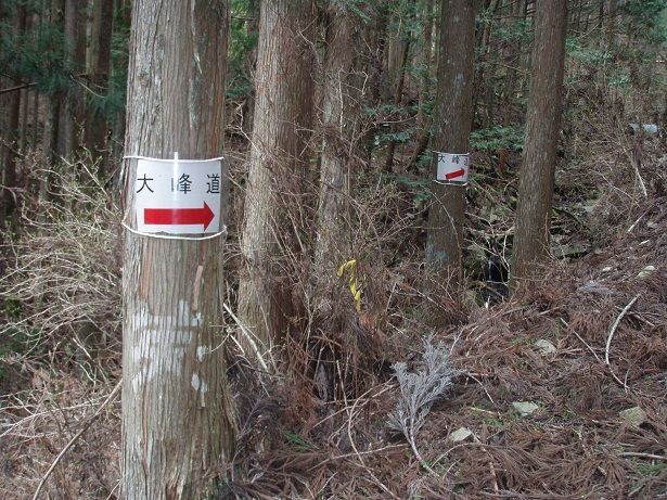 そのすぐ先から左手に階段の細道があるのでこれを進む。ここには「大峰道」と書かれた標識が立っている。