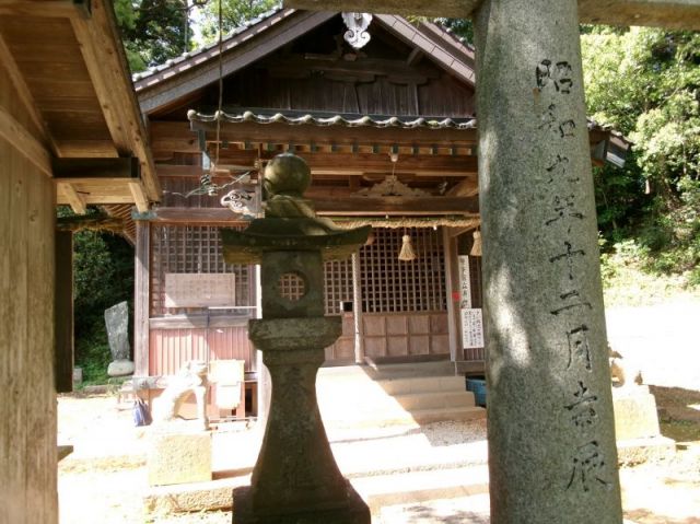 その先で29号線から右へ分岐して進むと、すぐ右手に「豊日神社」があり、寛政4年(1792)の鳥居が立っていて、かなり急で長い階段がある。13時33分にここに着く。ここに来るまでに、もうこの道を歩いたり、通ったりすることはないだろうという思いから、H君が「一期一会」という言葉を連発して歩いてきた。この長く急な階段を見て、皆大分疲れも出てきているようだったが、ここでも「一期一会」を合言葉にして階段を登って行った。途中階段の横に何やら石造りの屋根のような形をしたものがあったが、これが何なのかはわからなかった。途中でこのようなものがあるのであれば、階段を登ったところには何があるのだろう?と思いながら急な階段を登っていく。